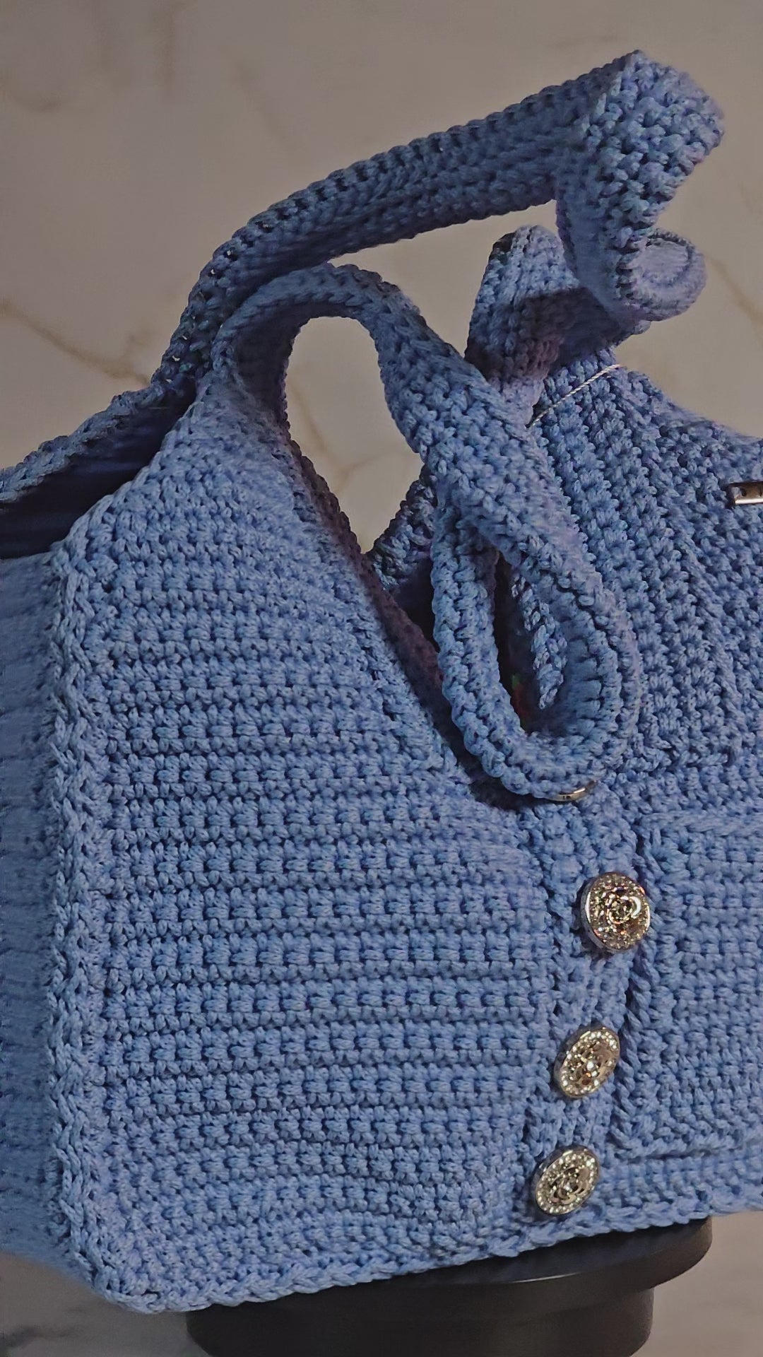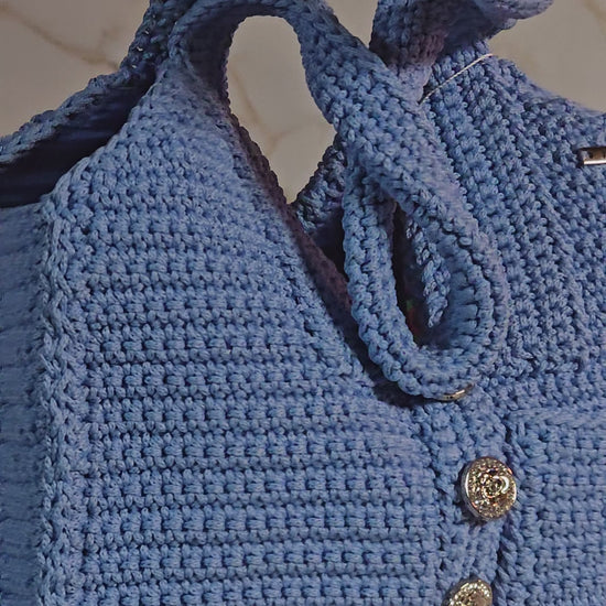 This exquisite Crochet Shirt Purse features a stunning blue color with luxurious silver buttons and a delicate satin blue lining. Its unique design combines fashion and functionality, making it a must-have accessory for any sophisticated and discerning individual. Elevate your style with this elegant and exclusive piece.